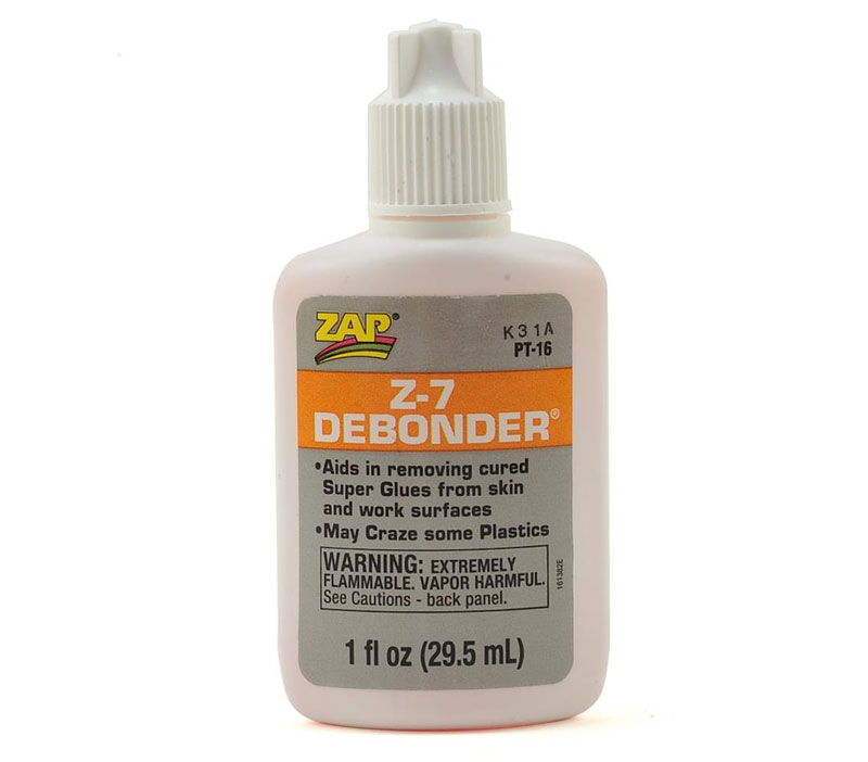 Растворитель для циакриновых клеев Pacer Zap Z-7 PT-16 (дебондер). Деактиватор Debonder позволяет размягчать клеевой шов, а затем разрушить крепкое клеевое соединение.