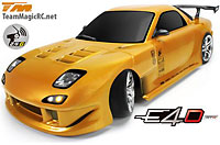Электрическая модель Team Magic на шасси E4JR с прекрасным корпусом Mazda. Модель хорошо сбалансирована, а центральное расположение мотора и аккумулятора улучшают управляемость.