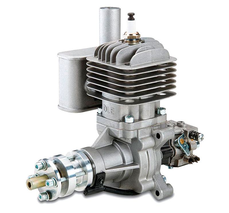 Двухтактный бензиновый двигатель внутреннего сгорания DLE-20 (1 цилиндр, 20 см.3, 2.5 л.с.) с боковым выхлопом для радиоуправляемых самолетов. В комплекте с системой зажигания, свечкой и глушителем.