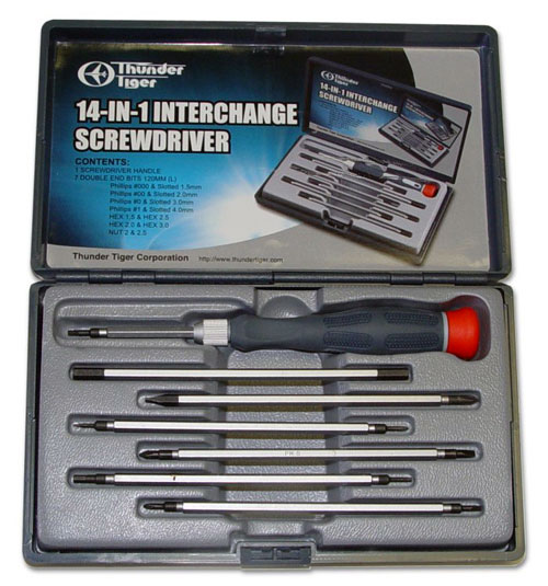 Артикул: TTR1197 Набор отверток 14 в одном. Специально поставляемый компанией Thunder Tiger для сборки радиоуправляемых вертолетов, этот набор включает наиболее часто встречающиеся размеры отверток, которые могут Вам понадобиться при работе с вертолетом. Полный набор поставляется в очень удобной компактной коробке. нет в наличии Артикул: TTR1197 Тип: Отвертки, ключи