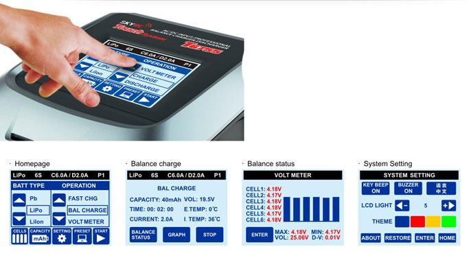 Мощное универсальное компьютерное зарядное устройство SkyRC T6755 с максимальным током заряда 7А, встроенным балансиром и блоком питания. Управление происходит с помощью цветного сенсорного экрана 65.85x49.63 мм. LCD 3.2" (320x240 dot).
