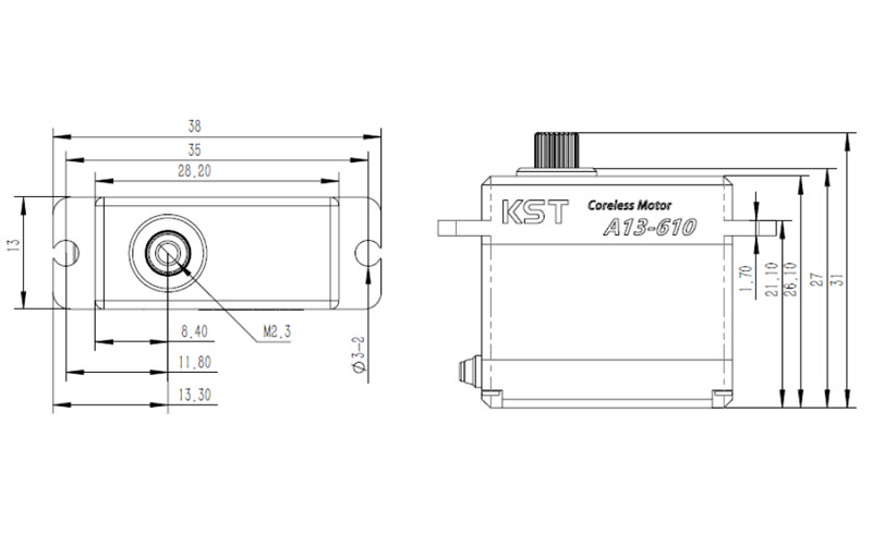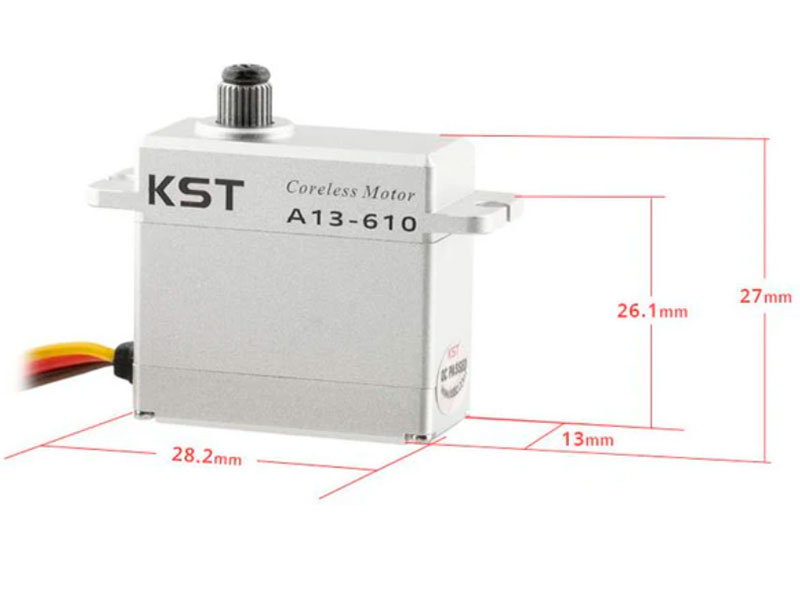Цифровая высоковольтная мини сервомашинка KST A13-610 со стальным редуктором. Корпус выполнен полностью из алюминия, который обеспечивает эффективное рассеивание тепла.