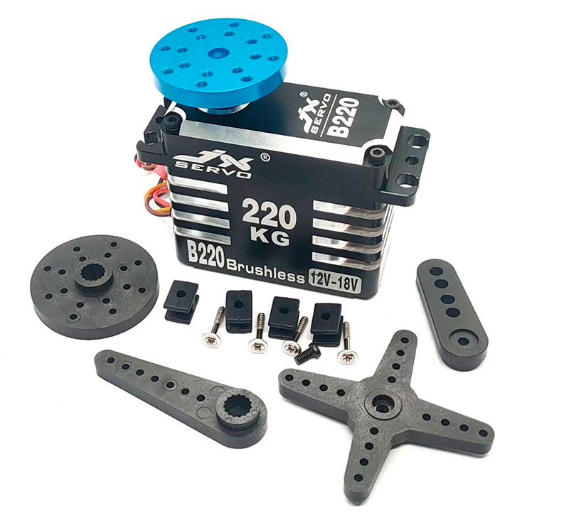 Мощный цифровой сервопривод JX B220 HV с усилием до 215 кг-см, металлическим редуктором и бесколлекторным мотором. Корпус выполнен полностью из алюминия, который обеспечивает эффективное рассеивание тепла.